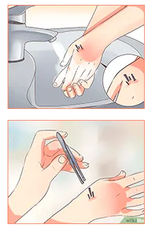 - Use água e sabão para lavar as mãos e a área ao redor do pequeno objeto perfurante, limpando o local do ferimento;